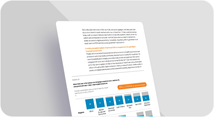 Qiubo educates merchants on their use. It also acts as an aggregator and helps open bank accounts on behalf of small merchants who may not have them. To help customers manage lumpy cash as a result of allowing merchants to accept utility payments, delivery drivers can collect cash and deposit it in accounts. And Red Qiubo works on behalf of merchants to create use cases for digital payments by, for example, negotiating with the government to let small-merchant POS terminals accept government food vouchers. A widely-accepted system of personal IDs is a requirement for safe digital financial transactions People cannot use formal financial services without some form of identification that enables providers to verify their identity and thereby minimize fraud and satisfy KYC regulations. Yet one in five individuals in emerging economies today remains unregistered in their country, 92 compared with one in ten in advanced economies (Exhibit 24). Even when people have an ID, they cannot register remotely for financial products if that ID cannot be authenticated online or through another digital mechanism. Having a national ID system, whether public or private, and digital authentication are thus essential for enabling digital finance to take off. Exhibit 24 More than one in five people in emerging economies lack a national ID, compared with one in ten in developed economies Formal registration rates across all ages by region 20%, or 1.5 billion, unregistered worldwide and focus country, 2014-15 % 99 93 90 89 83 64 62 Regions China Eastern Advanced Latin America Southeast South Asia Africa and Europe and economies Asia Middle East Central Asia Focus countries 99 90 64 40 China Brazil India Ethiopia 89 61 50 Mexico Pakistan Nigeria SOURCE: Identification for Development (ID4D) dataset, World Bank; McKinsey Global Institute analysis 92 Identification for Development Initiative (ID4D) global dataset 2014-2015, World Bank, January 2016. 66 McKinsey Global Institute 4. Capturing the opportunity