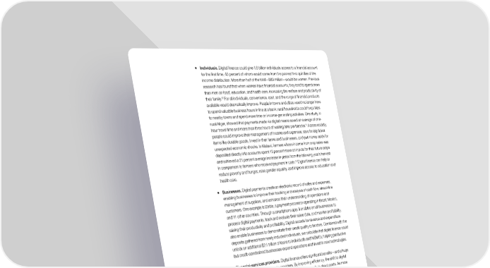 ƒ Individuals. Digital finance could give 1.6 billion individuals access to a financial account for the first time, 45 percent of whom would come from the poorest two quintiles of the income distribution. More than half of the total—880 million—would be women. Previous research has found that when women have financial accounts, they tend to spend more than men on food, education, and health care, increasing the welfare and productivity of 13 For all individuals, convenience, cost, and the range of financial products their family. available would dramatically improve. People in towns and cities would no longer have to spend valuable business hours in line at a bank; rural households could forgo trips to nearby towns and spend more time on income-generating activities. One study, in rural Niger, showed that payments made via digital means saved an average of one- 14 Across society, hour travel time and more than three hours of waiting time per transfer. people could improve their management of income and expenses, save for big-ticket items like durable goods, invest in their farms and businesses, and put money aside for unexpected economic shocks. In Malawi, farmers whose income from crop sales was deposited directly into accounts spent 13 percent more on inputs for their future crops and achieved a 21 percent average increase in yields from the following year’s harvest 15 Digital finance can help to in comparison to farmers who received payment in cash. reduce poverty and hunger, raise gender equality, and improve access to education and health care. ƒ Businesses. Digital payments create an electronic record of sales and expenses, enabling businesses to improve their tracking and analysis of cash flow, streamline management of suppliers, and enhance their understanding of operations and customers. One example is iZettle, a payment processor operating in Brazil, Mexico, and 11 other countries. Through a smartphone app, it enables small businesses to process digital payments, track and evaluate their sales data, and monitor profitability, raising their productivity and profitability. Digital records for revenue and expenditure also enable businesses to demonstrate their credit quality to lenders. Combined with the deposits gathered from newly included individuals, we calculate that digital finance could unlock an additional $2.1 trillion of loans to individuals and MSMEs, helping productive but credit-constrained businesses expand operations and invest in new technologies. ƒ Financial-services providers. Digital finance offers significant benefits—and a huge new business opportunity—to providers. By improving efficiency, the shift to digital payments from cash could save them $400 billion annually in direct costs. As more people obtain access to accounts and shift their savings from informal mechanisms, as much as $4.2 trillion in new deposits could flow into the financial system—funds that could then be loaned out. To unleash the full range and potential of new forms of digital finance, however, a much wider variety of players than banks will likely be involved. These may include telecoms companies, payment providers, financial technology startups, microfinance institutions (MFIs), retailers and other companies, and even handset manufacturers. ƒ Governments. Governments in emerging economies could collectively save at least $110 billion annually as digital payments reduce leakage in public expenditure and tax revenue. Of this, about $70 billion would come from ensuring that government spending reaches its target. This effectively would increase public investment in critical areas such as education, infrastructure, and health care. In addition, governments could gain approximately $40 billion annually from ensuring that tax revenue that is 13 Mattias Doepke and Michele Tertilt, Does female empowerment promote economic development? Centre for Economic Policy Research, discussion paper number 8441, June 2011. 14 Jenny C. Aker et al., Payment mechanisms and anti-poverty programs: Evidence from a mobile money cash transfer experiment in Niger, CDG working paper number 268, July 2015. 15 Lasse Brune et al., Facilitating savings for agriculture: Field experimental evidence from Malawi, NBER working paper number 20946, February 2015. McKinsey Global Institute Digital finance for all: Powering inclusive growth in emerging economies 9