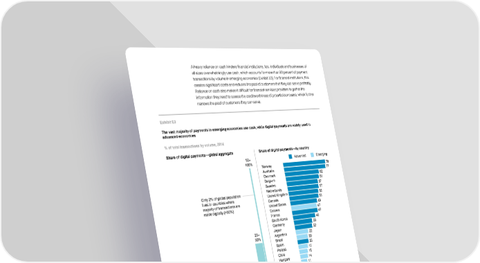 A heavy reliance on cash hinders financial institutions, too. Individuals and businesses of all sizes overwhelmingly use cash, which accounts for more than 90 percent of payment transactions by volume in emerging economies (Exhibit E3). For financial institutions, this creates significant costs and reduces the pool of customers that they can serve profitably. Reliance on cash also makes it difficult for financial-services providers to gather the information they need to assess the creditworthiness of potential borrowers, which further narrows the pool of customers they can serve. Exhibit E3 The vast majority of payments in emerging economies use cash, while digital payments are widely used in advanced economies % of total transactions by volume, 2014 Share of digital payments—global aggregate Share of digital payments—by country 50– Advanced Emerging 100% Norway 78 Australia 77 Denmark 62 Belgium 61 Sweden 57 Only 2% of global population Netherlands 57 lives in countries where United Kingdom 55 majority of transactions are Canada 53 made digitally (>50%) United States 49 Estonia 47 France 47 South Korea 40 Germany 33 25– Japan 32 50% Argentina 22 Brazil 20 Spain 20 Poland 17 Chile 15 Hungary 14 South Africa 11 3 of 4 people live in countries 15– Mexico 11 with only marginal usage of 25% Russia 11 digital payments (<5%) 5– Malaysia 10 15% Saudi Arabia 6 China 4 Peru 4 0–5% Romania 3 Philippines 2 Indonesia 1 0 20 40 60 80 100 India <1 Nigeria <1 Global population Pakistan <1 % of total Ethiopia <1 SOURCE: McKinsey Global Payments Map; World Bank; McKinsey Global Institute analysis REPEATS in report McKinsey Global Institute Digital finance for all: Powering inclusive growth in emerging economies 5