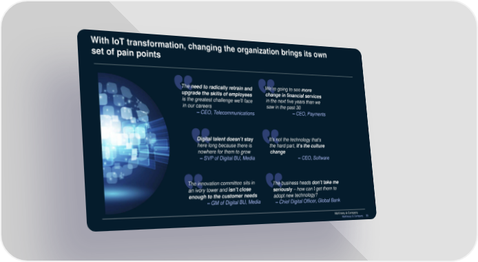 With IoT transformation, changing the organization brings its own set of pain points The need to radically retrain and We’re going to see more upgrade the skills of employees change in financial services is the greatest challenge we’ll face in the next five years than we in our careers saw in the past 30 –CEO, Telecommunications –CEO, Payments Digital talent doesn’t stay It’s not the technology that’s here long because there is the hard part, it’s the culture nowhere for them to grow change –SVPof Digital BU, Media –CEO, Software The innovation committee sits in The business heads don’t take me an ivory tower and isn’t close seriously – how can I get them to enough to the customer needs adopt new technology? –GM of Digital BU, Media –Chief Digital Officer, Global Bank McKinsey & Company McKinsey & Company 39