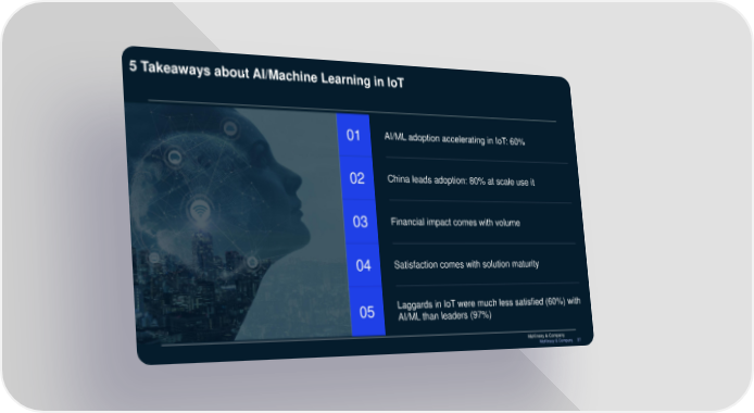 5 Takeaways about AI/Machine Learning in IoT 01 AI/ML adoption accelerating in IoT: 60% 02 China leads adoption: 80% at scale use it 03 Financial impact comes with volume 04 Satisfaction comes with solution maturity 05 Laggards in IoT were much less satisfied (60%) with AI/ML than leaders (97%) McKinsey & Company McKinsey & Company 37