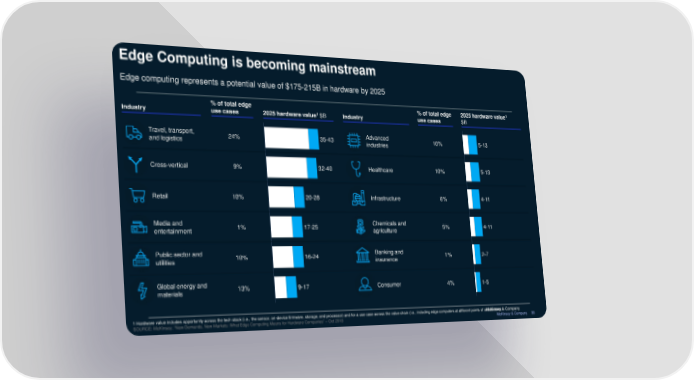 Edge Computing is becoming mainstream Edge computing represents a potential value of $175-215B in hardware by 2025 1 % of total edge % of total edge 2025 hardware value 1 Industry use cases 2025 hardware value $B Industry use cases $B Travel, transport, 24% 35-43 Advanced 10% 5-13 and logistics industries Cross-vertical 9% 32-40 Healthcare 10% 5-13 Retail 10% 20-28 Infrastructure 6% 4-11 Media and 1% 17-25 Chemicals and 5% 4-11 entertainment agriculture Public sector and 10% 16-24 Banking and 1% 2-7 utilities insurance Global energy and 13% 9-17 Consumer 4% 1-5 materials 1 Hardware value includes opportunity across the tech stack (i.e., the sensor, on-device firmware, storage, and processor) and for a use case across the value chain (i.e., including edge computers at different points of architecture) McKinsey & Company SOURCE:McKinsey, “New Demands, New Markets: What Edge Computing Means for Hardware Companies” – Oct 2018 McKinsey & Company 38
