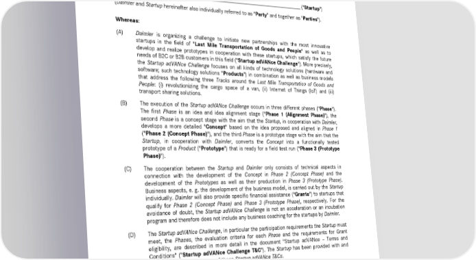 4 Startup adVANce | Cooperation Agreement Cooperation Agreement "Startup adVANce" This Cooperation Agreement (including these main provisions and the annexes hereinafter referred to as "Agreement") is concluded between the following Parties: (1) Daimler AG, Mercedesstrasse 137, 70565 Stuttgart ("Daimler") and (2) ________________________________________________________________ ("Startup") (Daimler and Startup hereinafter also individually referred to as "Party" and together as "Parties"). Whereas: (A) Daimler is organizing a challenge to initiate new partnerships with the most innovative startups in the field of "Last Mile Transportation of Goods and People" as well as to develop and realize prototypes in cooperation with these startups, which satisfy the future needs of B2C or B2B customers in this field ("Startup adVANce Challenge"). More precisely, the Startup adVANce Challenge focuses on all kinds of technology solutions (hardware and software; such technology solutions "Products") in combination as well as business models that address the following three Tracks around the Last Mile Transportation of Goods and People: (i) revolutionizing the cargo space of a van, (ii) Internet of Things (IoT) and (iii) transport sharing solutions. (B) The execution of the Startup adVANce Challenge occurs in three different phases ("Phase"). The first Phase is an idea and idea alignment stage ("Phase 1 (Alignment Phase)"), the second Phase is a concept stage with the aim that the Startup, in cooperation with Daimler, develops a more detailed "Concept" based on the idea proposed and aligned in Phase 1 ("Phase 2 (Concept Phase)"), and the third Phase is a prototype stage with the aim that the Startup, in cooperation with Daimler, converts the Concept into a functionally tested prototype of a Product ("Prototype") that is ready for a field test run ("Phase 3 (Prototype Phase)"). (C) The cooperation between the Startup and Daimler only consists of technical aspects in connection with the development of the Concept in Phase 2 (Concept Phase) and the development of the Prototypes as well as their production in Phase 3 (Prototype Phase). Business aspects, e. g. the development of the business model, is carried out by the Startup individually. Daimler will also provide specific financial assistance ("Grants") to startups that qualify for Phase 2 (Concept Phase) and Phase 3 (Prototype Phase), respectively. For the avoidance of doubt, the Startup adVANce Challenge is not an acceleration or an incubation program and therefore does not include any business coaching for the startups by Daimler. (D) The Startup adVANce Challenge, in particular the participation requirements the Startup must meet, the Phases, the evaluation criteria for each Phase and the requirements for Grant eligibility, are described in more detail in the document "Startup adVANce – Terms and Conditions" ("Startup adVANce Challenge T&C"). The Startup has been provided with and has declared its acceptance of these Startup adVANce T&Cs. (E) The Parties intend to further specify their mutual rights and obligations for their cooperation in Phase 2 (Concept Phase) and, potentially, Phase 3 (Prototype Phase) of the Startup adVANce Challenge. THEREFORE IT IS AGREED AS FOLLOWS: