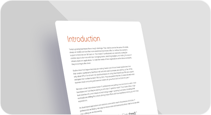 Introduction Today’s growing businesses face a tough challenge. They need to provide the same affordable, always-on mobile services that more established businesses offer, but without the economic support enterprises can fall back on. That means IT professionals are constantly looking for creative ways to do more with less: managing teams, stretching budgets, and making the most of infrastructure and applications. To meet the needs of their organisations within those constraints, they’re turning to the cloud. Studies show that large enterprises are making heavier use of cloud-based applications than their smaller counterparts, but that small and mid-sized businesses are catching up fast. While only about 37% of small and mid-sized businesses are using cloud-based apps this year, experts anticipate that number to reach 78% by 2020. They also predict that the US small and mid-sized business cloud computing and services market will grow from $43B to $55B this year.1,2 We took a closer look at how today’s IT professionals are putting cloud solutions to work in their businesses and how they’re starting to shift their IT spend to match. This e-book offers a high- level overview of current cloud and technology usage in growing businesses, including what workloads are shifting first, what’s driving these efforts and how experience is lining up with these expectations. As cloud-based applications and solutions come within reach of businesses of all sizes, IT professionals are finding new ways to reduce costs and boost productivity. Read on to see what your colleagues are discovering. 1 Cloud-based app adoption, looking ahead: 78% 37% 2015 2020 The Small Business Cloud Outlook - Introduction 2