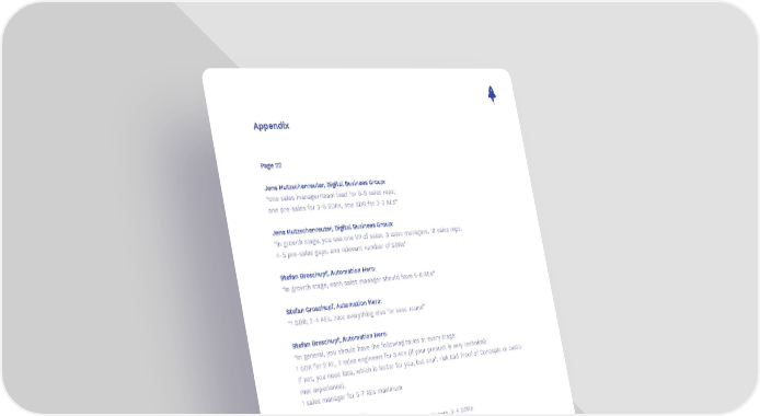 Appendix Page 22 Jens Hutzschenreuter, Digital Business Group: “one sales manager/team lead for 6-8 sales reps; one pre-sales for 3-6 SDRs, one SDR for 2-3 AEs” Jens Hutzschenreuter, Digital Business Group: “in growth stage, you see one VP of sales, 3 sales managers, 18 sales reps, 4-5 pre-sales guys, and relevant number of SDRs” Stefan Groschupf, Automation Hero: “in growth stage, each sales manager should have 6-8 AEs” Stefan Groschupf, Automation Hero: “1 SDR; 2-4 AEs, zero everything else for seed round” Stefan Groschupf, Automation Hero: “In general, you should have the following ratios at every stage: 1 SDR for 2 AE, 2 sales engineers for 3 AEs (if your product is very technical; if not, you need less, which is better for you, but don’t risk bad Proof of Concepts or custo- mer experience), 1 sales manager for 5-7 AEs maximum Amnon Drori, Octopai: Seed stage 1 AE, Series A 2-10 AEs, 1-2 sales engineers, 3-4 SDRs Jean Belanger, Cerebri AI: Seed stage 0 AE, Series A 2-4 AEs, 1-2 sales engineers, 1-2 SDRs Jens Hutzschenreuter, Digital Business Group: Seed stage 3 AE, Series A 8 AEs, 1 sales engineer, 3 SDRs Neil Ryland, Peakon: Seed stage 1 AE; Series A 2-4 AEs, all depends on market size and traction Peter Krauss: Seed stage 1 AE; Series A 2-4 AEs, 1-2 sales engineers, 2-4 SDRs 93