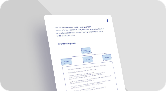 The KPIs for sales growth graphic—based on a SaaStr podcast interview with Kristina Shen, a Partner at Bessemer Venture Part- ners—sets out some of the KPIs and rules that investors follow when it comes to company value: KPIs for sales growth Drivers of company value Velocity of Efficiency Retention growth • Best cloud companies scale from €1 to €10m Annual Recurring Revenue (ARR) in 2 years • Average cloud companies scale from €1 to €10m ARR in 3 years • Rule of 40 - established, later stage, public companies: Growth in % + Profit in % is equal or greater than 40 (i.e. you can grow by 30% and have a 10% profit or even grow by 100% and have a 60% loss = both equal 40%) • Rule of 70 - for fast-growing private companies in Series A/B, around 2 years before going public: Growth in % + Profit in % is equal or greater than 70% • ARR measures revenues - what should be measured instead of ARR is the velocity of growth: How fast are you adding new customers AND retaining existing business • Capital efficiency is important and can be measured: For a company with less than €20m in revenue, the ARR should be greater than the amount they burn in the same period Example: Revenue growth from €10m to €20m; burned €20m to do this = €10m gain/€20m cost = 0.5 efficiency score; Bessemer Venture Partners aim for an efficiency score of 1 • Burn less capital each month to acquire additional revenue; this is particularly valid for Series B companies Source: Kristina Shen, Bessemer Venture Partners Source: SaaStr podcast 176 https://player.fm/series/the-official-saastr-podcast-saas-founders-investors/saastr-176- what-saas-startups-need-to-raise-a-series-a-today-why-we-need-a-new-framework-to-think-about-saas-multi- ples-and-how-the-rule-of-40-changes-with-scale-with-kristina-shen-partner-bessemer-venture-partners 43
