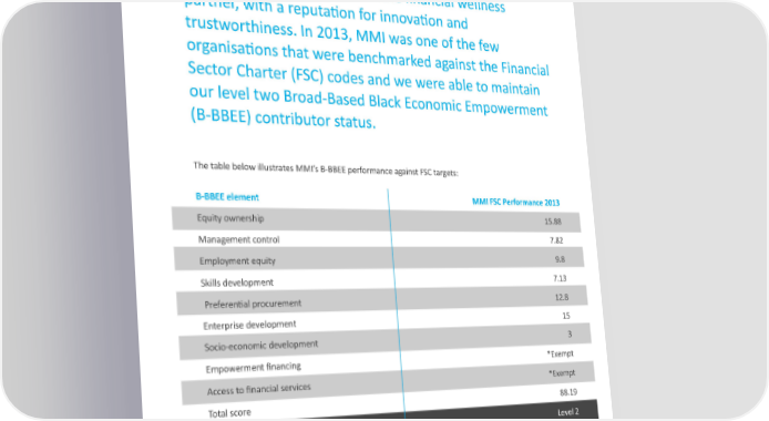 Transformation remains an important pillar in realising our vision to be the preferred lifetime financial wellness partner, with a reputation for innovation and trustworthiness. In 2013, MMI was one of the few organisations that were benchmarked against the Financial Sector Charter (FSC) codes and we were able to maintain our level two Broad-Based Black Economic Empowerment (B-BBEE) contributor status. The table below illustrates MMI’s B-BBEE performance against FSC targets: B-BBEE element MMI FSC Performance 2013 Equity ownership 15.88 Management control 7.82 Employment equity 9.8 Skills development 7.13 Preferential procurement 12.8 Enterprise development 15 Socio-economic development 3 Empowerment financing *Exempt Access to financial services *Exempt Total score 88.19 B-BBEE rating Level 2 *Enhanced recognition due to the exemption of empowerment financing and access to financial services. 29