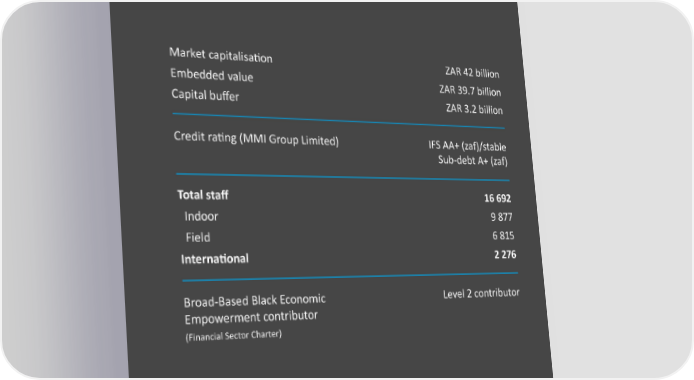 Market capitalisation ZAR 42 billion Embedded value ZAR 39.7 billion Capital buffer ZAR 3.2 billion Credit rating (MMI Group Limited) IFS AA+ (zaf)/stable Sub-debt A+ (zaf) Total staff 16 692 Indoor 9 877 Field 6 815 International 2 276 Broad-Based Black Economic Level 2 contributor Empowerment contributor (Financial Sector Charter) 11