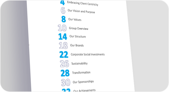 Contents 2 Our Roots 4 Embracing Client Centricity 6 Our Vision and Purpose 8 Our Values 10 Group Overview 14 Our Structure 18 Our Brands 22 Corporate Social Investments 26 Sustainability 28 Transformation 30 Our Sponsorships 32 Our Achievements 34 Contact Details 1