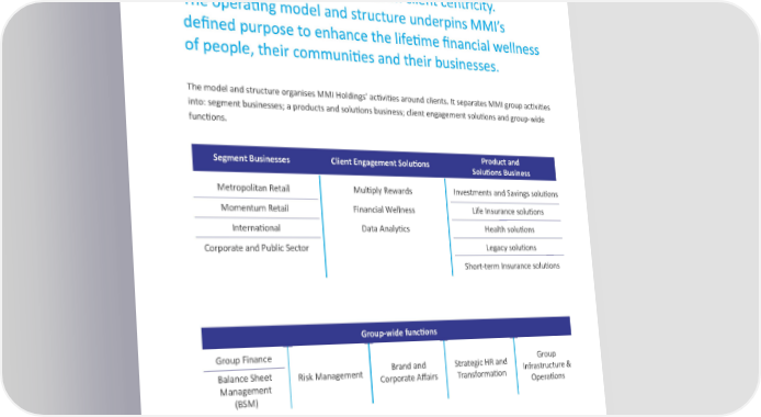 MMI Holdings has built an operating model and structure that supports its strategic focus on client centricity. The operating model and structure underpins MMI’s defined purpose to enhance the lifetime financial wellness of people, their communities and their businesses. The model and structure organises MMI Holdings’ activities around clients. It separates MMI group activities into: segment businesses; a products and solutions business; client engagement solutions and group-wide functions. Segment Businesses Client Engagement Solutions Product and Solutions Business Metropolitan Retail Multiply Rewards Investments and Savings solutions Momentum Retail Financial Wellness Life Insurance solutions International Data Analytics Health solutions Corporate and Public Sector Legacy solutions Short-term Insurance solutions Group-wide functions Group Finance Group Balance Sheet Risk Management Brand and Strategic HR and Infrastructure & Management Corporate Affairs Transformation Operations (BSM) The segment businesses are made up of Metropolitan Retail, Momentum Retail, Corporate and Public Sector, and International. The Client Engagement Solutions area optimises client engagement capabilities and ensures an appropriate focus on this critical part of MMI’s strategy. The Products and Solutions business focuses on designing and developing solutions to fulfil the needs of clients identified by the segment businesses. Group-wide functions include Group Finance, Brand and Corporate Affairs, Strategic Human Resources and Transformation, Risk Management and Group Infrastructure and Operations. 15