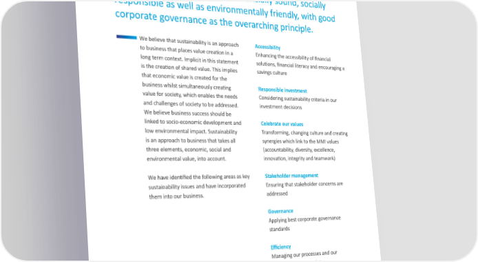MMI Holdings is fully committed to the principles of sustainability. We strive to be financially sound, socially responsible as well as environmentally friendly, with good corporate governance as the overarching principle. We believe that sustainability is an approach Accessibility to business that places value creation in a Enhancing the accessibility of financial long term context. Implicit in this statement solutions, financial literacy and encouraging a is the creation of shared value. This implies savings culture that economic value is created for the business whilst simultaneously creating Responsible investment value for society, which enables the needs Considering sustainability criteria in our and challenges of society to be addressed. investment decisions We believe business success should be linked to socio-economic development and Celebrate our values low environmental impact. Sustainability Transforming, changing culture and creating is an approach to business that takes all synergies which link to the MMI values three elements, economic, social and (accountability, diversity, excellence, environmental value, into account. innovation, integrity and teamwork) We have identified the following areas as key Stakeholder management sustainability issues and have incorporated Ensuring that stakeholder concerns are them into our business. addressed Governance Applying best corporate governance standards Efficiency Managing our processes and our environmental footprint 27