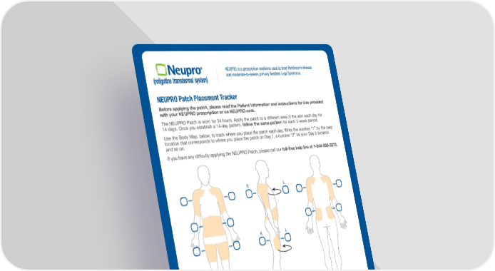 NEUPRO is a prescription medicine used to treat Parkinson’s disease and moderate-to-severe primary Restless Legs Syndrome. NEUPRO Patch Placement Tracker Before applying the patch, please read the Patient Information and Instructions for Use provided with your NEUPRO prescription or on NEUPRO.com. The NEUPRO Patch is worn for 24 hours. Apply the patch to a different area of the skin each day for 14 days. Once you establish a 14-day pattern, follow the same pattern for each 2-week period. Use the Body Map, below, to track where you place the patch each day. Write the number “1” by the map location that corresponds to where you place the patch on Day 1, a number “2” by your Day 2 location, and so on. If you have any difficulty applying the NEUPRO Patch, please call our toll-free help line at 1-844-599-2273. R L R L FRONT SIDE BACK Please visit www.NEUPRO.com to: • Watch a video about how to apply the NEUPRO Patch • See if you qualify to save on NEUPRO • Learn more about the NEUPRO Patch Please see Important Safety Information on the reverse side.