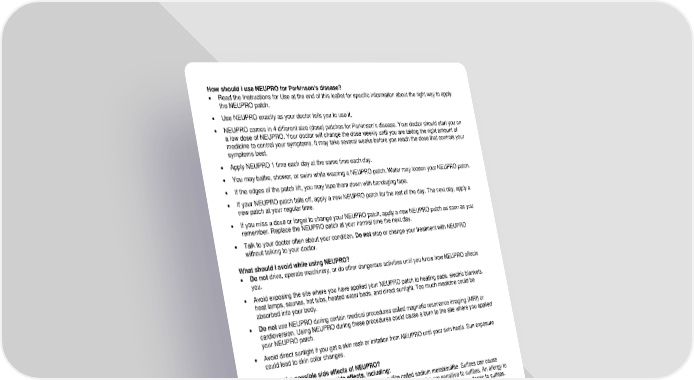 How should I use NEUPRO for Parkinson’s disease? • Read the Instructions for Use at the end of this leaflet for specific information about the right way to apply the NEUPRO patch. • Use NEUPRO exactly as your doctor tells you to use it. • NEUPRO comes in 4 different size (dose) patches for Parkinson’s disease. Your doctor should start you on a low dose of NEUPRO. Your doctor will change the dose weekly until you are taking the right amount of medicine to control your symptoms. It may take several weeks before you reach the dose that controls your symptoms best. • Apply NEUPRO 1 time each day at the same time each day. • You may bathe, shower, or swim while wearing a NEUPRO patch. Water may loosen your NEUPRO patch. • If the edges of the patch lift, you may tape them down with bandaging tape. • If your NEUPRO patch falls off, apply a new NEUPRO patch for the rest of the day. The next day, apply a new patch at your regular time. • If you miss a dose or forget to change your NEUPRO patch, apply a new NEUPRO patch as soon as you remember. Replace the NEUPRO patch at your normal time the next day. • Talk to your doctor often about your condition. Do not stop or change your treatment with NEUPRO without talking to your doctor. What should I avoid while using NEUPRO? • Do not drive, operate machinery, or do other dangerous activities until you know how NEUPRO affects you. • Avoid exposing the site where you have applied your NEUPRO patch to heating pads, electric blankets, heat lamps, saunas, hot tubs, heated water beds, and direct sunlight. Too much medicine could be absorbed into your body. • Do not use NEUPRO during certain medical procedures called magnetic resonance imaging (MRI) or cardioversion. Using NEUPRO during these procedures could cause a burn to the site where you applied your NEUPRO patch. • Avoid direct sunlight if you get a skin rash or irritation from NEUPRO until your skin heals. Sun exposure could lead to skin color changes. What are the possible side effects of NEUPRO? NEUPRO can cause serious side effects, including: • severe allergic reactions. NEUPRO contains a sulfite called sodium metabisulfite. Sulfites can cause severe allergic reactions that are life threatening to some people who are sensitive to sulfites. An allergy to sulfites is not the same as an allergy to sulfa. People with asthma are more likely to be allergic to sulfites. Remove your NEUPRO patch right away and call your doctor if you have swelling of the lips or tongue, chest pain, trouble breathing or swallowing. • falling asleep during normal activities. You may fall asleep while doing normal activities such as driving a car, doing physical tasks, or using hazardous machinery while taking NEUPRO. You may suddenly fall asleep without being drowsy or without warning. This may result in having accidents. Your chances of falling asleep while doing normal activities while using NEUPRO are greater if you take other medicines that cause drowsiness. Tell your doctor right away if this happens. Before starting NEUPRO, be sure to tell your doctor if you take any medicines that make you drowsy. • hallucinations and other psychosis. NEUPRO can cause or worsen psychotic symptoms including hallucinations (seeing or hearing things that are not real), confusion, excessive suspicion, aggressive behavior, agitation, delusional beliefs (believing things that are not real), and disorganized thinking. The chances of having hallucinations or these other psychotic-like changes are higher in people with Parkinson’s disease who are elderly, taking NEUPRO, or taking higher doses of NEUPRO. If you have hallucinations or any of these other psychotic-like changes, talk with your doctor.