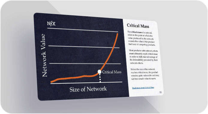 Critical Mass The critical mass of a network refers to the point at which the value produced by the network exceeds the value of the product itself and of competing products. Most products with network effects must ultimately reach critical mass in order to fully take advantage of the defensibility provided by their network effects. Before the size of the network reaches critical mass, the product remains quite vulnerable and may not have much value to users. Read more about Critical Mass 18