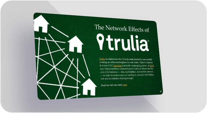 Trulia revolutionized the US real estate market by successfully creating an online marketplace for real estate. Trulia’s Founder & former CEO Pete Flint (currently a managing partner at NFX) says Trulia built three distinct types of network effects into the core of its business — data, marketplace, and market network — in order to achieve success, leading to a massive $3.5 billion exit and an industry-shaping merger. Read the full case study here. 10