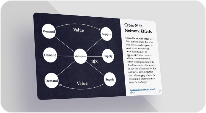 Cross-Side Network Effects Cross-side network effects are direct network effects that arise from complementary goods or services in a network with more than one side. As opposed to indirect network effects, cross-side network effects refers specifically to the direct increase in value to users on one side of a network by the addition of users to another side. More supply is better for the demand. More demand is better for the Supply. Read more about cross-side network effects 27