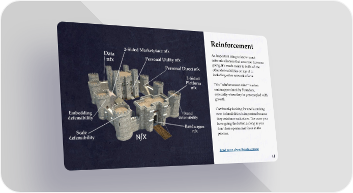 Reinforcement An important thing to know about network effects is that once you have one going, it’s much easier to build all the other defensibilities on top of it, including other network effects. This “reinforcement effect” is often underappreciated by Founders, especially when they’re preoccupied with growth. Continually looking for and launching new defensibilities is important because they reinforce each other. The more you have going the better, as long as you don’t lose operational focus in the process. Read more about Reinforcement 41