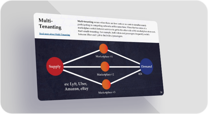 Multi-tenanting occurs when there are low costs or no costs to simultaneously Multi- participating in competing networks at the same time. When the two sides of a marketplace switch between services to get to the other side of the marketplace at no cost, Tenanting that’s multi-tenanting. For example, both riders and passengers frequently switch between Uber and Lyft to find rides/passengers. Read more about Multi-Tenanting 34