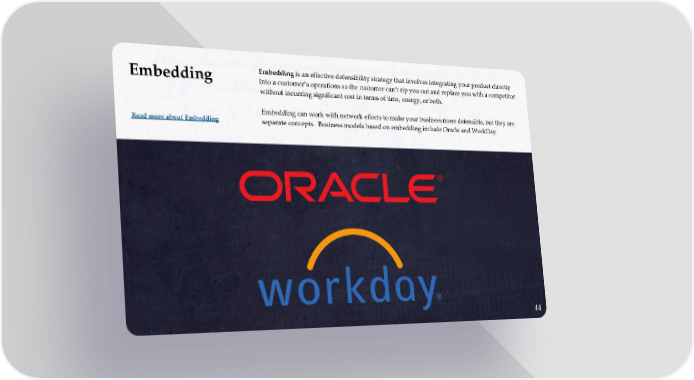 Embedding is an effective defensibility strategy that involves integrating your product directly Embedding into a customer’s operations so the customer can’t rip you out and replace you with a competitor without incurring significant cost in terms of time, energy, or both. Embedding can work with network effects to make your business more defensible, but they are Read more about Embedding separate concepts. Business models based on embedding include Oracle and WorkDay. 3744
