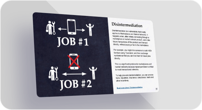 Disintermediation Disintermediation is a vulnerability that mostly applies to Marketplaces and Market Networks. It happens when, after initially connecting through a marketplace or market network product, users take future transactions off the product and transact directly, without paying a fee to the marketplace. For example, you might hire someone to build IKEA furniture using Taskrabbit, and then exchange numbers so that you can hire them for future jobs directly. This is a significant problem for marketplaces and market networks because repeat purchase is critical to most transactional networks. To help prevent disintermediation, you can provide tools, reputation, insurance, compliance, leads and other incentives. Read more about Disintermediation 35