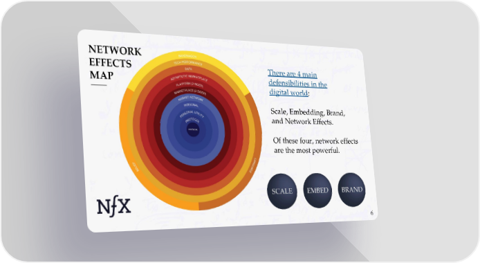 There are 4 main defensibilities in the digital world: Scale, Embedding, Brand, and Network Effects. Of these four, network effects are the most powerful. 6