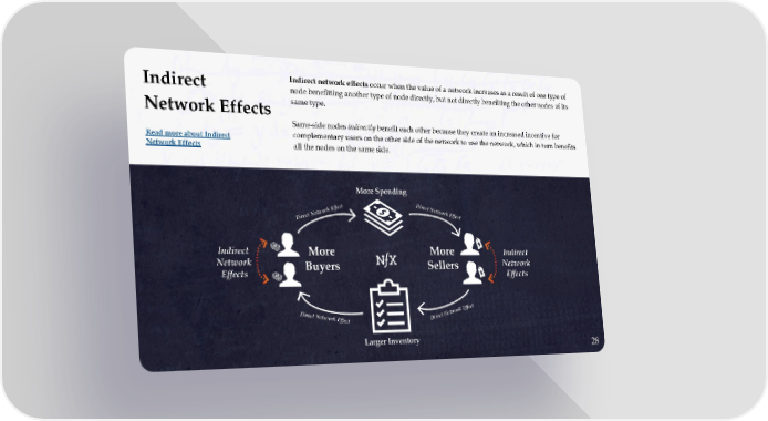 Indirect network effects occur when the value of a network increases as a result of one type of Indirect node benefitting another type of node directly, but not directly benefiting the other nodes of its same type. Network Effects Same-side nodes indirectly benefit each other because they create an increased incentive for complementary users on the other side of the network to use the network, which in turn benefits Read more about Indirect Network Effects all the nodes on the same side. 28