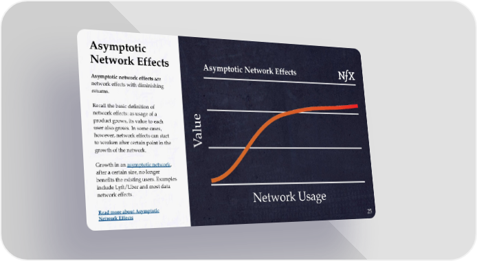 Asymptotic Network Effects Asymptotic network effects are network effects with diminishing returns. Recall the basic definition of network effects: as usage of a product grows, its value to each user also grows. In some cases, however, network effects can start to weaken after certain point in the growth of the network. Growth in an asymptotic network, after a certain size, no longer benefits the existing users. Examples include Lyft/Uber and most data network effects. Read more about Asymptotic Network Effects 25