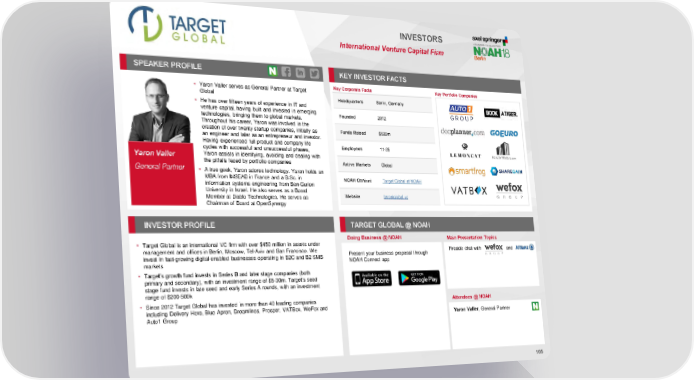 INVESTORS International Venture Capital Firm SPEAKER PROFILE KEY INVESTORFACTS • Yaron Valler serves as General Partner at Target Key Corporate Facts Key Portfolio Companies Global Headquarters Berlin, Germany • He has over fifteen years of experience in IT and venture capital, having built and invested in emerging Founded 2012 technologies, bringing them to global markets. Throughout his career, Yaron was involved in the creation of over twenty startup companies, initially as Funds Raised $533m an engineer and later as an entrepreneur and investor. Having experienced full product and company life Employees 11-25 cycles with successful and unsuccessful phases, Yaron assists in identifying, avoiding and dealing with Yaron Valler the pitfalls faced by portfolio companies General Partner Active Markets Global • A true geek, Yaron adores technology. Yaron holds an MBA from INSEAD in France and a B.Sc. in information systems engineering from Ben-Gurion NOAH Content Target Global at NOAH University in Israel. He also serves as a Board Member at Diablo Technologies. He serves as Website targetglobal.vc Chairman of Board at OpenSynergy INVESTORPROFILE TARGET GLOBAL @ NOAH Doing Business @ NOAH Main Presentation Topics • Target Global is an international VC firm with over $450 million in assets under management and offices in Berlin, Moscow, Tel-Aviv and San Francisco. We Present your business proposal through Fireside chat with and invest in fast-growing digital-enabled businesses operating in B2C and B2 SMB NOAH Connect app markets • Target’s growth fund invests in Series B and later stage companies (both primary and secondary), with an investment range of $5-30m. Target’s seed stage fund invests in late seed and early Series A rounds, with an investment range of $200-500k • Since 2012 Target Global has invested in more than 40 leading companies Attendees @ NOAH including Delivery Hero, Blue Apron, Dreamlines, Prosper, VATBox, WeFox and Auto1 Group Yaron Valler, General Partner 105
