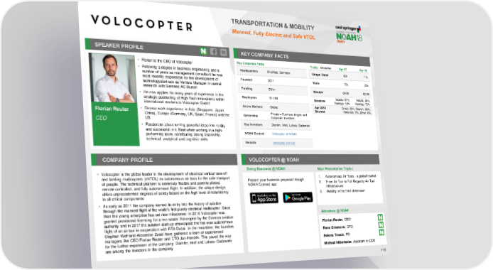 TRANSPORTATION & MOBILITY Manned, Fully Electric and Safe VTOL SPEAKER PROFILE KEY COMPANY FACTS • Florian is the CEO of Volocopter Key Corporate Facts Traffic Apr-17 Apr-18 • Following a degree in business engineering and a Headquarters Bruchsal, Germany Unique Users 30k 11k number of years as management consultant he was Founded 2011 most recently responsible for the development of Visits 75k 23k technologystart-ups as Venture Manager in central Funding €31m research with Siemens AG Munich Minutes 00:30 02:35 • He now applies his many years of experience in the Employees 51-100 Mobile: 57% Mobile: 28% strategic positioning of High-Tech innovations within Sessions Desktop: 43% Desktop: 72% international markets to Volocopter GmbH Active Markets Global Apr 2018 Direct: 25%, Search: 60%, • Diverse work experience in Asia (Singapore, Japan, Sources Referrals: 9%, Other: 6% Florian Reuter Private – Businses Angels and China), Europe (Germany, UK, Spain, France) and the Ownership Corporate Investors CEO US • Passionate about turning powerful ideas into reality - Key Investors Daimler, Intel, Lukasz Gadowski and successful in it. Best when working in a high- performing team, contributing strong leadership, NOAH Content Volocopter at NOAH technical, analytical and cognitive skills Website volocopter.com/en/ COMPANY PROFILE VOLOCOPTER@ NOAH Doing Business @ NOAH Main Presentation Topics • Volocopter is the global leader in the development of electrical vertical take-off and landing multicopters (eVTOL) as autonomous air taxis for the safe transport Present your business proposal through 1. Autonomous Air Taxis - a global market of people. The technical platform is extremely flexible and permits piloted, NOAH Connect app 2. From Air Taxi to Full Megacity Air Taxi remote controlled, and fully autonomous flight. In addition, the unique design infrastructure offers unprecedented degrees of safety based on the high level of redundancy 3. Mobility in the third dimension in all critical components • As early as 2011 the company earned its entry into the history of aviation through the manned flight of the world’s first purely electrical multicopter. Since then the young enterprise has set new milestones: In 2016 Volocopter was granted provisional licensing for a two-seater Volocopter by the German aviation Attendees @ NOAH authority and in 2017 the aviation start-up showcased the first ever autonomous Florian Reuter, CEO flight of an air taxi in cooperation with RTA Dubai. In the meantime, the founders Stephan Wolf and Alexander Zosel have gathered a team of experienced Rene Griemens, CFO managers like CEO Florian Reuter and CTO Jan-Hendrik. This paved the way for the further expansion of the company. Daimler, Intel and Lukasz Gadowski Helena Treeck, PR are among the investors in the company Michael Hillermeier, Assistant to CEO 119