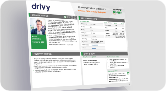 TRANSPORTATION & MOBILITY European P2P Car Rental Marketplace SPEAKER PROFILE KEY COMPANY FACTS • Paulin is the founder and CEO of Drivy, Europe’s Key Corporate Facts Traffic Apr-17 Apr-18 leading carsharing platform. He launched Drivy in Headquarters Paris, France Unique Users 0.3m 0.4m 2010 in France, with the idea of sharing idle private cars to offset the high cost of ownership while Founded 2011 Visits 0.9m 0.8m providing a great mobility option to neighbours • With his team, he then moved on to a much more Funding €47m Minutes 05:57 06:25 ambitious goal: making Drivy so convenient it could Mobile: 53% Mobile: 52% replace car ownership altogether and have a positive Employees 100-1,000 Sessions Desktop: 47% Desktop: 48% environmental impact on cities. Active Markets International Apr 2018 Direct: 38%, Search: 52%, • Paulin, an HEC graduate, started his career in the Sources Referrals: 5%, Other: 5% Paulin container shipping sector where he held regional Ownership Private – VCs management positions in Hong Kong and Sao Paulo. Dementhon He is passionate about mobility, sustainability, and an Alven Capital, Index Ventures, Founder & CEO avid urban bike rider Key Investors Nokia Growth Partners • Paulin is 39, lives in Paris and is a father of 2 NOAH Content Drivy at NOAH Website drivy.com COMPANY PROFILE DRIVY@ NOAH Doing Business @ NOAH Main Presentation Topics • Drivy is the leading carsharing platform in Europe, with 50,000 cars in 6 countries. Car-free urban people use the app to find a car around the corner, 1. Drivy's evolution as a marketplace over open it with their phone and use it for a few hours to a few days to go where Service Providers Interest the last 7 years they need to Ecommerce Services – Platforms 2. Why the entire automotive value chain is • Drivy’s fleet is crowdsourced from private people who want to offset their cost, Mobility & Transport platforms now on Drivy? and professional fleet owners who are investing in mobility. 3. What's the future of new mobility • Drivy is bringing fresh air to urban people, providing more freedom to move platforms? while using fewer cars and less parking space Attendees @ NOAH Paulin Dementhon, Founder & CEO Nils Rossmeisl, Country Manager DE Patrick Foster, COO Sviatoslav Beysens, Head of Public Affairs Mats Joosten, Comms Manager, DE & AT 40