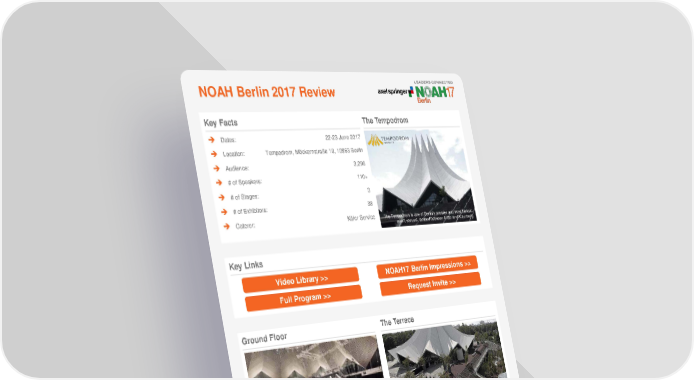 NOAH Berlin 2017 Review Key Facts The Tempodrom Dates: 22-23 June 2017 Location: Tempodrom, Möckernstraße 10, 10963 Berlin Audience: 3,296 # of Speakers: 110+ # of Stages: 3 # of Exhibitors: 38 Caterer: Käfer Service The Tempodromis one of Berlin’s premier and most historic event venues, located between Mitte and Kreuzberg Key Links Video Library >> NOAH17 Berlin Impressions >> Full Program >> Request Invite >> Ground Floor The Terrace Seating for up to 3,000 guests in the main and 5,500 sqm outdoor space will be covered in lounge 1,000 sqm indoor space areas, exhibition stands and catering booths. 60