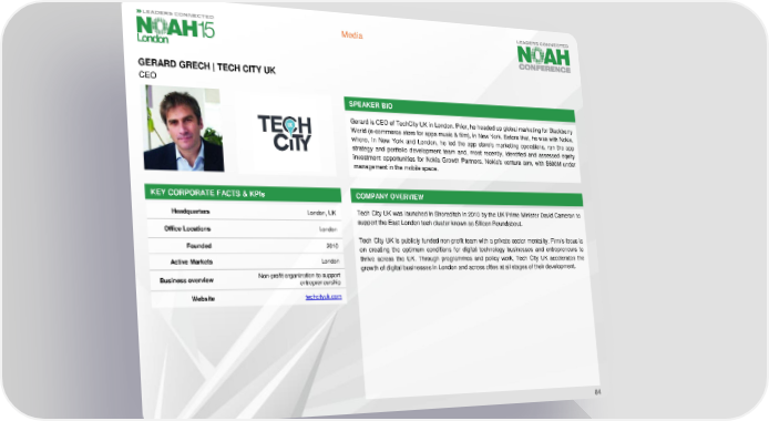 Media GERARD GRECH| TECH CITY UK CEO SPEAKER BIO Gerard is CEO of TechCity UK in London. Prior, he headed up global marketing for Blackberry World (e-commerce store for apps music & film), in New York. Before that, he was with Nokia, where, in New York and London, he led the app store's marketing operations, ran the app strategy and portfolio development team and, most recently, identified and assessed equity investment opportunities for Nokia Growth Partners, Nokia's venture arm, with $600M under managementinthemobilespace. KEY CORPORATE FACTS& KPIs COMPANY OVERVIEW Headquarters London, UK Tech City UK was launched in Shoreditch in 2010 by the UK Prime Minister David Cameron to support the East London tech cluster known as Silicon Roundabout. Office Locations London Founded 2010 Tech City UK is publicly funded non-profit team with a private sector mentality. Firm’s focus is on creating the optimum conditions for digital technology businesses and entrepreneurs to Active Markets London thrive across the UK. Through programmes and policy work, Tech City UK accelerates the growth of digital businesses in London and across cities at all stages of their development. Business overview Non-profit organization to support entrepreneurship Website techcityuk.com 84