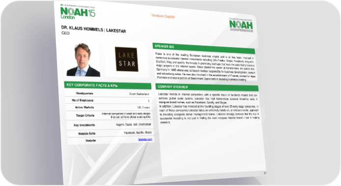 Venture Capital DR. KLAUS HOMMELS | LAKESTAR CEO SPEAKER BIO Klaus is one of the leading European business angels and is or has been involved in numerous successful internet investments including QXL/Tradus, Skype, Facebook, king.com, StarDoll, Xing and spotify. He invests in promising start-ups that have the potential to become major players in the internet space. Klaus started his career at Bertelsmann. He joined AOL Germanyin1995 where was as board member responsible for business development, content and advertising sales. He was also involved in the establishment of Freenet, worked for Apax Partners and was a partner of Benchmark Capital before founding Hommels Holding. KEY CORPORATE FACTS& KPIs COMPANY OVERVIEW Headquarters Zurich Switzerland Lakestar invests in Internet companies, with a specific focus on business models that can No of Employees 5 achieve global scale quickly. Lakestar has had tremendous success investing early in marqueebrandnames,suchasFacebook,Spotify,andSkype. Active Markets US, Europe In addition, Lakestar has invested at the founding stages of over 25 early stage companies. In each of these companies Lakestar takes an extremely hands-on, or entrepreneurial, approach Target Criteria Internet companies in seed and early stages to investing alongside stellar management teams. Lakestar strongly believes that the key to that can achieve global scale quickly successful investing is not just in finding the next marquee Internet brand – but in helping Key Investments Algomi, Taulia, Sofi, Onefootball create it. Notable Exits Facebook, Spotify, Skype Website lakestar.com 47