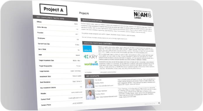 Project A KEY CORPORATE FACTS / KPIS INVESTOR DESCRIPTION Offices Berlin TheBerlin-based investor makes use of €260m in assets under management to back early-stage companies in the digital technology space. Project A is pursuing a unique operational VC approach that provides its ventures with capital, an extensive network and exclusive access to a wide range of operational expertise. With its unique organizational structure featuring 100 operational experts, Project A offers its portfolio companies hands-on Active Markets n/a support in the areas of Software Engineering, Digital Marketing, Design, Communications, Business Intelligence, Sales and Recruiting. Founded 2011 Theportfolio includes companies such as KRY, Catawiki, WorldRemit, Spryker, Contorion, uberall and eyeota. You can find more information at www.project-a.com and on the blog insights.project-a.com/. Employees 100 SELECTED PORTFOLIO COMPANIES Current Fund Size €140m Catawiki is a global online auction platform which unites buyers and sellers of special objects and collectibles in a unique way. The company was founded in 2008, since 2011, Catawiki has been hosting weekly auctions for special Use of Debt No objects, from comic books to classic cars and everything in between. With millions of visitors from across the world every month, Catawiki is the most trusted place for selling high-quality and hard-to-find objects online. AUM €260m KRY is a digital health startup, providing its users a modern care experience by offering a digital healthcare center where patients can meet a doctor via video. The app is developed for patients who need healthcare for medical concerns that do not require a physical examination for diagnosis. KRY is an approved healthcare provider and is therefore subject to the same rules and regulations as all other providers of healthcare in Sweden. Target Investment Size €500k - €5m WorldRemit is an online service that lets people send money to friends and family living abroad, using a computer, smartphone or tablet. It is a convenient, low-cost alternative to traditional money transfer companies that use high Target Geographies Europe street agents and charge unreasonable fees. Money can be received as a bank deposit, cash pick-up, Mobile Money, or mobile airtime top-up. WorldRemit’s service is available to senders in 50 countries. It offers transfers to more than 140 destinations across Europe, Asia, Africa, Australia and the Americas. Target Sectors Digital Technology Full Portfolio www.project-a.com/en/portfolio Investment Style Venture Capital KEY CONTACTS Deal Structures Seed / Series A Thies Sander Thies is a founding partner at Project A. In this role, Thies is a trusted advisor to Founding Partner Project A portfolio companies and oversees Project A's investor relations and talent management activities. Thies is serving on the board of companies as for Key Investment Criteria n/a Email: thies.sander@project-a.com example KRY, Spryker, uberall and Contorion. Dr. Florian Heinemann Florian Heinemann is a founding partner at Project A, where he is responsible Website www.project-a.com for marketing, CRM and business intelligence. Prior to his current role, he was a Founding Partner managing director at Rocket Internet (2007-2012). At Rocket, he was instrumental in building Zalando, Global Fashion Group and eDarling/Affinitas. Contact Email investing@project-a.com Email: Florian.heinemann@project-a.com Florian is serving on the board of companies as for example WorldRemit, Eyeota, Opinary and CrossEngage. Contact Phone +49 30 340606301 INVESTOR BOOK 92