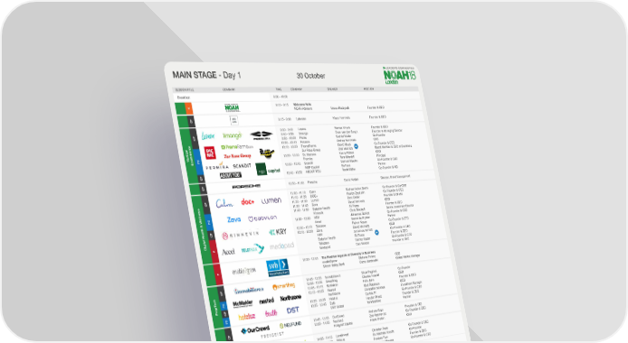 MAIN STAGE - Day 1 30 October SESSION TITLE COMPANY TIME COMPANY SPEAKER POSITION Breakfast 8:00 - 10:00 K 9:10 - 9:15 Welcome Note ® NOAH Advisors Marco Rodzynek Founder & CEO CP 9:15 - 9:30 Lakestar Klaus Hommels Founder & CEO 9:30 - 9:40 Lesara Roman Kirsch Founder & CEO CP 9:40 - 9:50 limango Sven van den Bergh Founder & Managing Director 9:50 - 10:00 Picnic Michiel Muller Co-Founder 10:00 - 10:10 Fessura Andrea Vecchiola CEO 10:10 - 10:20 PromoFarma David Masó MR Co-Founder & CEO ertical Zur Rose Group Olaf Heinrich Board Member & CEO of DocMorris 10:20 - 10:30 Dr. Martens Kenny Wilson CEO V EcommerceFC Permira Tara Alhadeff Principal 10:30 - 10:40 Scandit Samuel Mueller Co-Founder & CEO NGP Capital Bo Ilsoe Partner CP 10:40 - 10:50 ABOUT YOU Tarek Müller Co-Founder & MD CP 10:50 - 11:00 Porsche Deniz Keskin Director, Brand Management 11:00 - 11:10 Calm Michael Acton Smith Co-Founder & Co-CEO CP 11:10 - 11:20 DOC+ Ruslan Zaydullin Co-Founder & CEO 11:20 - 11:30 Lumen Dror Ceder Founder & CPMO 11:30 - 11:40 Zava David Meinertz CEO ellness 11:40 - 11:50 Babylon Health Ali Parsa Founder & CEO FC Kinnevik Chris Bischoff Senior Investment Director 11:50 - 12:00 KRY Johannes Schildt Co-Founder & CEO Accel Sonali de Rycker Partner CP 12:00 - 12:10 Telepaxx Rainer Kasan Co-Founder & CTO 12:10 - 12:30 Zava David Meinertz CEO KRY Johannes Schildt Co-Founder & CEO Digital Health & WP Babylon Health Ali Parsa MR Founder & CEO Telepaxx Rainer Kasan Co-Founder & CTO Medopad Dan Vahdat Founder & CEO 12:30 - 12:45 The Positive Impacts of Diversity in Business P enable2grow Stefanie Peters CEO Silicon Valley Bank Oscar Jazdowski Global Market Manager 12:45 - 12:55 Immobiliare.it Silvio Pagliani Co-Founder CP 12:55 - 13:05 Smartfrog Charles Fraenkl CEO 13:05 - 13:15 McMakler Felix Jahn Founder & CEO ech 13:15 - 13:25 Nested Matt Robinson CEO FC Northzone Christoffer Norman Investment Manager PropT CP 13:25 - 13:35 Holaluz Carlota Pi Co-Founder & CEO 13:35 - 13:45 Bulb Hayden Wood Founder & CEO FC DST Global Tom Stafford Partner 13:45 - 13:55 OurCrowd Andrew Kaye President & CIO CP 13:55 - 14:05 Neufund Zoe Adamovicz Co-Founder & CEO Freigeist Capital Frank Thelen CEO 14:05 - 14:15 LendInvest Christian Faes Co-Founder & CEO 14:15 - 14:25 Billie.io Dr. Matthias Knecht Co-Founder CP 14:25 - 14:35 Oakam Frederic Nze Founder & CEO LendingPlatforms 14:35 - 14:45 Prodigy Finance Cameron Stevens Co-Founder & CEO FC 14:45 - 14:55 Klarna Michael Rouse MR CCO Permira Andrew Young Principal 14:55 - 15:05 SafeCharge Yuval Ziv MR CCO PaymentsCP 15:05 - 15:15 Credorax Igal Rotem CEO 15:15 - 15:25 SumUp Marc-Alexander Christ Co-Founder FC 15:25 - 15:35 simplesurance Robin von Hein MR Founder & CEO ech Rakuten Mark Haviland EVP Global Development T 15:35 - 15:45 GoCompare Faisal Galaria Chief Strategy Officer InsuranceCP CP 15:45 - 15:55 Monzo Tom Blomfield CEO 15:55 - 16:05 N26 Alexander Weber MR Head of International Markets FC 16:05 - 16:15 solarisBank Dr. Roland Folz CEO 16:15 - 16:25 Revolut Nikolay Storonsky Founder & CEO CP 16:25 - 16:35 Tandem Ricky Knox CEO 16:35 - 16:45 Moonfare Alexander Argyros Founder Moonfare Hans Haderer Former Senior Partner, BC Partners 16:45 - 16:55 Deposit Solutions Dr. Tim Sievers MR Founder & CEO FC Vitruvian Partners Torsten Winkler Partner Banking of the Future 16:55 - 17:05 Stocard Björn Goß Founder & CEO Macquarie Capital Elmar Broscheit Managing Director 17:05 - 17:15 360T Carlo Kölzer MR Group CEO CP 17:15 - 17:25 Zopa Jaidev Janardana CEO CP 17:25 - 17:35 Blockchain Nicolas C. Cary Co-Founder 17:35 - 17:45 Ledger Éric Larchevêque CEO Crypto FC Draper Esprit Ben Tompkins Managing Director 17:45 - 18:00 Intel Capital Karen Stafford Investment Director for Northern & CEE P innogy Innovation Hub Annemie Ress MR Managing Director InvestorPanel OneRagtime Stéphanie Hospital Founder & CEO K 18:00 - 18:05 Closing Note ® NOAH Advisors Marco Rodzynek Founder & CEO 18:05 - 20:00 Networking Drinks Lunch served between 12:00 - 13:30 CP Company K Keynote P Panel FC Fireside MR Interview / Panel with participation of Marco 2 Presentation Chat Rodzynek Founder & CEO, NOAH Advisors