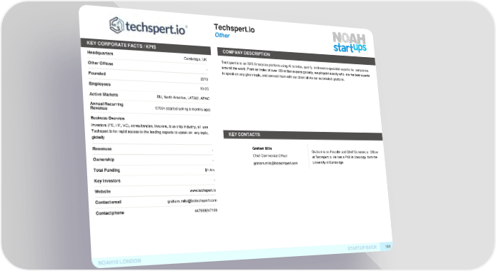 Techspert.io Other KEY CORPORATE FACTS /KPIS COMPANYDESCRIPTION Headquarters Cambridge, UK Techspert.io is an B2B Enterprise platform using AI to index, qualify, and source specialist experts for companies OtherOffices - around the world. From an index of over 150 million experts globally, we pinpoint exactly who are the best experts to speak on any given topic, and connect them with our client all via our automated platform. Founded 2016 Employees 10-25 Active Markets EU, North America, LATAM, APAC AnnualRecurring £750k (started selling 8 months ago) Revenue Business Overview Investors (PE, HF, VC), consultancies, insurers, blue chip industry, all use Techspert.io for rapid access to the leading experts to speak on any topic,KEYCONTACTS globally Revenues - Graham Mills Graham is co-Founder and Chief Commercial Officer Chief Commercial Officer Ownership at Techspert.io. He has a PhD in Oncology from the - [email protected] of Cambridge TotalFunding $1.4m KeyInvestors - Website www.techspert.io Contactemail [email protected] Contactphone 447999247196 NOAH18LONDON STARTUPBOOK 184