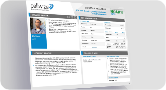BIG DATA & ANALYTICS SON (Self Organizing Network) Solutions to Mobile Operators SPEAKER PROFILE KEY COMPANY FACTS ▪ Ofir is the CEO of Cellwize since 2013 Key Corporate Facts Key Financials ▪ Before he joined Cellwize, Ofir co-founded and led all Headquarters Tel Aviv, Israel Revenues 2017 €11-50m the outbound activity of Pontis (Bought by Amdocs in 2013). Pontis pioneered contextual marketing for Founded 2013 EBITDA 2017 €1-10m Telecoms ▪ Before Pontis, Ofir led the marketing of the Employees 100-1,000 Traffic Jan-17 Jan-18 messaging division of Comverse, and was a general manager of one of the divisions Active Markets Global Unique Users <5k <5k Ofir Zemer Funding €15m Visits <5k 12k CEO Ownership Private – VCs Minutes 05:44 05:56 Key Investors Viola Group Sessions Mobile: 0% Mobile: 37% Desktop: 100% Desktop: 63% Website cellwize.com Jan 2018 Direct: 65%, Search: 12%, Sources Referrals: 21%, Other: 2% COMPANY PROFILE CELLWIZE @ NOAH Doing Business @ NOAH Main Presentation Topics ▪ Cellwize provides cutting-edge SON (Self Organizing Network) solutions to mobile carriers and connected enterprise. Networks empowered by Cellwize Looking for Service Providers within: 1. Cellwize is currently working with major continuously react to real-time changes and match capacity, coverage and Communications OEMs in the Automotive market to ensure connectivity in order to support quality with evolving usage patterns and users’ needs ▪ Our solutions utilize Big Data processing to transform volatile networks into connected and autonomous cars user-centric and over-performing mobile networks across multiple wireless 2. Cellwize is currently working with major technologies and form factors . Our agile and proven technology improves Telecom Carriers in the world in order network management and reduces on-going CAPEX and OPEX investments. revolutionize the way the roll out and It offers mobile operators in-depth insights into essential network information to optimize their next generation networks differentiate their offering and provide superior personalized user experience 3. cellwize is leading the way in embedded targeting areas of high-value density its functionalities in 5G, ONAP and HetNet technologies Attendees @ NOAH Ofir Zemer, CEO 28