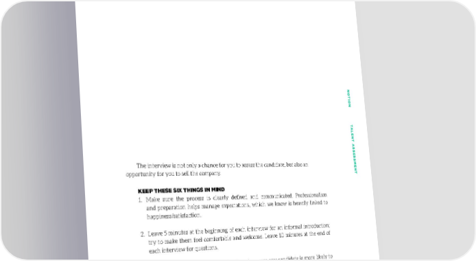 REMEMBER THAT CANDIDATES ARE ALSO ASSESSING YOU NONO TION TTION T ALENT AALENT A SS SESSES The interview is not only a chance for you to assess the candidate, but also an SMENTSMENT opportunity for you to sell the company. KEEP THESE SIX THINGS IN MIND 1. Make sure the process is clearly defined and communicated. Professionalism and preparation helps manage expectations, which we know is heavily linked to happiness/satisfaction. 2. Leave 5 minutes at the beginning of each interview for an informal introduction; try to make them feel comfortable and welcome. Leave 10 minutes at the end of each interview for questions. 3. Ask relevant questions. With a structured process any candidate is more likely to perceive the questions as more related to their role and not just ‘fluff’. 4. Let them meet other people outside the group (even if just for a chat that has no impact on the candidate’s score). 5. For internal stakeholders, walk through the reasoning for - and intended outcomes of - the structured interview process so that everyone is aligned with why it’s being done, and why it may feel a little ‘formal’ in places. 5454