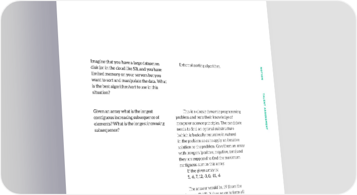 Imagine that you have a large dataset on External sorting algorithm. NONO disk (or in the cloud like S3), and you have TION TTION T limited memory on your servers but you want to sort and manipulate the data. What is the best algorithm/sort to use in this situation? ALENT AALENT A SS Given an array what is the longest This is a classic dynamic programming SESSES contiguous increasing subsequence of problem and tests their knowledge of elements? What is the longest increasing computer science principles. The candidate SMENTSMENT subsequence? needs to find an optimal substructure (which is basically recursive in nature) in the problem so as to apply an iterative solution to the problem. Give them an array with integers (positive, negative, zero) and they are supposed to find the maximum contiguous sum in this array. If the given array is: 5, -6, 7, 12, -3, 0, -11, -6 The answer would be, 19 (from the sub-array {7,12}). If they go on to form all the possible sets and then finding the one with the biggest sum, their algorithm would have a mammoth-like time complexity. They should use dynamic programming and finish quickly. More specific Java, PHP, Linux questions are available at Github and Katemats.com. 6565