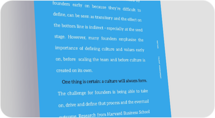 Culture and values represent the underlying fabric of any organisation. Despite this foundational role, culture and values are rarely prioritised by founders early on because they’re difficult to define, can be seen as transitory and the effect on the bottom line is indirect - especially at the seed stage. However, many founders emphasise the NO TION T importance of defining culture and values early on, before scaling the team and before culture is ALENT A S created on its own. SES SMENT One thing is certain: a culture will always form. The challenge for founders is being able to take on, drive and define that process and the eventual outcome. Research from Harvard Business School has shown that by actively managing culture, organisations are more likely to deliver on their strategic objectives in the long run. 9
