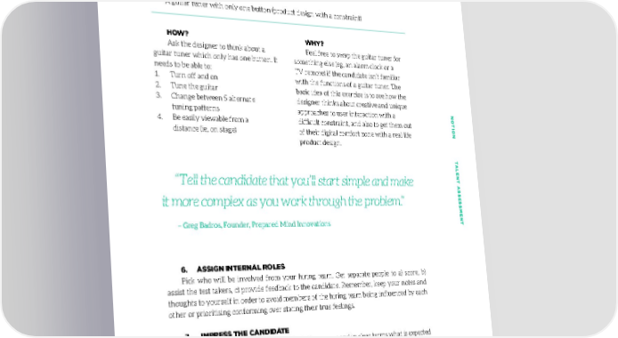 WHAT? A guitar tuner with only one button (product design with a constraint) HOW? WHY? Ask the designer to think about a Feel free to swap the guitar tuner for guitar tuner which only has one button. It something else (eg, an alarm clock or a needs to be able to: TV remote) if the candidate isn’t familiar 1. Turn off and on with the functions of a guitar tuner. The 2. Tune the guitar basic idea of this exercise is to see how the 3. Change between 5 alternate designer thinks about creative and unique tuning patterns approaches to user interaction with a NONO 4. Be easily viewable from a difficult constraint, and also to get them out TION TTION T distance (ie, on stage) of their digital comfort zone with a real life product design. ALENT AALENT A “Tell the candidate that you’ll start simple and make SS it more complex as you work through the problem.” SESSES SMENTSMENT – Greg Badros, Founder, Prepared Mind Innovations 6. ASSIGN INTERNAL ROLES Pick who will be involved from your hiring team. Get separate people to a) score, b) assist the test takers, c) provide feedback to the candidate. Remember, keep your notes and thoughts to yourself in order to avoid members of the hiring team being influenced by each other or prioritising conforming over stating their true feelings. 7. IMPRESS THE CANDIDATE Make sure you tell the candidate early in the process and in clear terms what is expected and how the test process works. Hiring is a two-way street and you have to manage the candidate’s expectations and keep them happy and interested throughout the process. 8. ALWAYS IMPROVE After your hiring cycle ends make sure you analyse whether the test turned out to be a good predictor of performance and employee longevity. As the company passes through fundraising stages this data will become better and better. If correlation is low or negative, make changes to your test. 6262