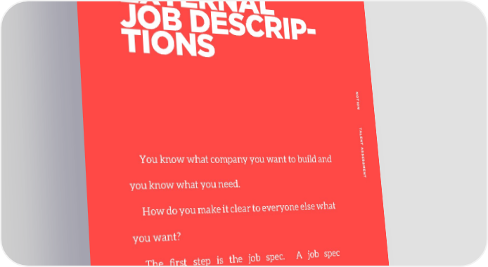 GENERATING INTERNAL & EXTERNAL JOB DESCRIP- TIONS NO TION T ALENT A S You know what company you want to build and SES SMENT you know what you need. How do you make it clear to everyone else what you want? The first step is the job spec. A job spec galvanises the fleeting thoughts and images founders have of their requirements into something specific, into a person. 30