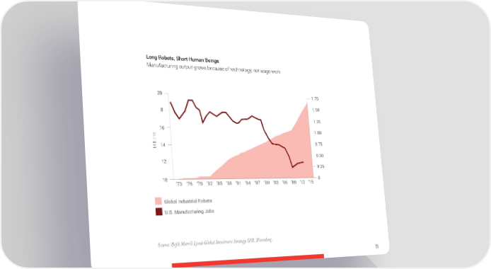 Long Robots, Short Human Beings Manufacturing output grows because of technology, not wage work 20 1.75 8 1.50 1.25 16 1.00 Millions14 0.75 0.50 12 0.25 10 ’73 ’76 ’79 ’82 ’85 ’88 ’91 ’94 ’97 ’00 ’03 ’06 ’09 ’12 ’15 0 Global Industrial Robots U.S. Manufacturing Jobs Source: BofA Merrill Lynch Global Investment Strategy, IFR, Bloomberg. 25