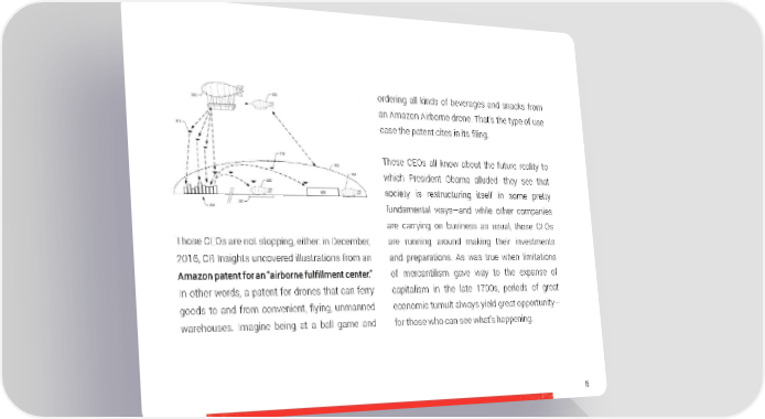 ordering all kinds of beverages and snacks from an Amazon Airborne drone. That’s the type of use case the patent cites in its filing. These CEOs all know about the future reality to which President Obama alluded—they see that society is restructuring itself in some pretty fundamental ways—and while other companies are carrying on business as usual, those CEOs Those CEOs are not stopping, either: in December, are running around making their investments 2016, CB Insights uncovered illustrations from an and preparations. As was true when limitations Amazon patent for an “airborne fulfillment center.” of mercantilism gave way to the expanse of In other words, a patent for drones that can ferry capitalism in the late 1700s, periods of great goods to and from convenient, flying, unmanned economic tumult always yield great opportunity— warehouses. Imagine being at a ball game and for those who can see what’s happening. 15