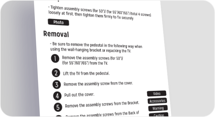 Set-up - Tighten assembly screws (for 50”)/ (for 55”/60”/65”) (total 4 screws) loosely at first, then tighten them firmly to fix securely Photo Removal - Be sure to remove the pedestal in the following way when using the wall-hanging bracket or repacking the TV. 1 Remove the assembly screws (for 50”)/ (for 55”/60”/65”) from the TV. 2 Lift the TV from the pedestal. 3 Remove the assembly screw from the cover. 4 Pull out the cover. Video 5 Remove the assembly screws from the Bracket. Accessories 6 Remove the assembly screws from the Back of Warning stand and pull out the neck. Caution