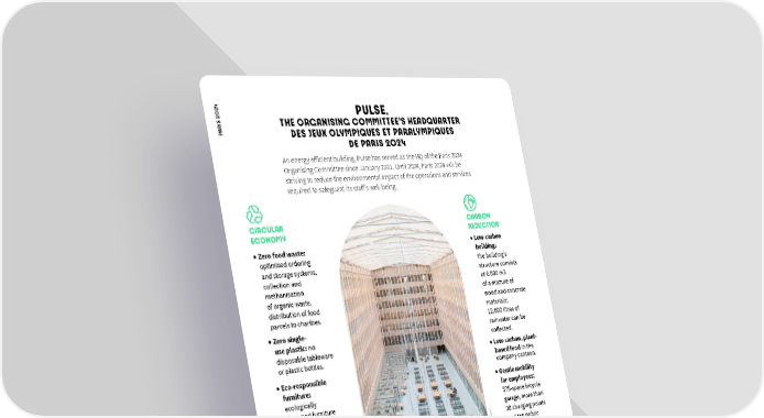 4 PULSE, 02 THE ORGANISING COMMITTEE’S HEADQUARTER PARIS 2 DES JEUX OLYMPIQUES ET PARALYMPIQUES DE PARIS 2024 An energy efficient building, Pulse has served as the HQ of the Paris 2024 Organising Committee since January 2021. Until 2024, Paris 2024 will be striving to reduce the environmental impact of the operations and services required to safeguard its staff’s well-being. CIRCULAR CARBON ECONOMY REDUCTION Zero food waste: Low-carbon building: optimised ordering and storage systems, the building’s collection and structure consists methanisation of 6.000 m3 of organic waste, of a mixture of distribution of food wood and concrete parcels to charities. materials; Zero single- 12,000 litres of use plastic: no rainwater can be disposable tableware collected. or plastic bottles. Low-carbon, plant- Eco-responsible based food in the company canteen. furniture: Gentle mobility ecologically for employees: designed furniture 375-space bicycle and solutions for the garage, more than reuse, repurposing or donation of furniture eul 30 charging points after the Games. and ten public y Courmac transport lines around the building. © Thierr 100% renewable French energy: 300 m2 of solar panels on the roof, INCLUSION LOCAL 100% renewable COMMITMENT energy (biogas and Building fully accessible to people with green electricity reduced mobility and training for canteen staff 1/3 of service from a French on how to assist them. providers from wind farm under Seine- Saint-Denis a direct contract) Inclusive recruitment for service providers: S 25% of technical maintenance staff are disabled. for hospitality, and contribution to E M 60% of service providers involved in the maintenance and biogas generation A N G building’s operations are from the Social catering contracts, etc. from organic waste. E P and Solidarity Economy and two thirds of Comp any canteen Full offsetting 4 O employees are participating in occupational serves 20% 2 of carbon emissions 0 integration schemes. local produce, S 2 linked to the I sourced within a R A building’s operations. P 200km radius. 30