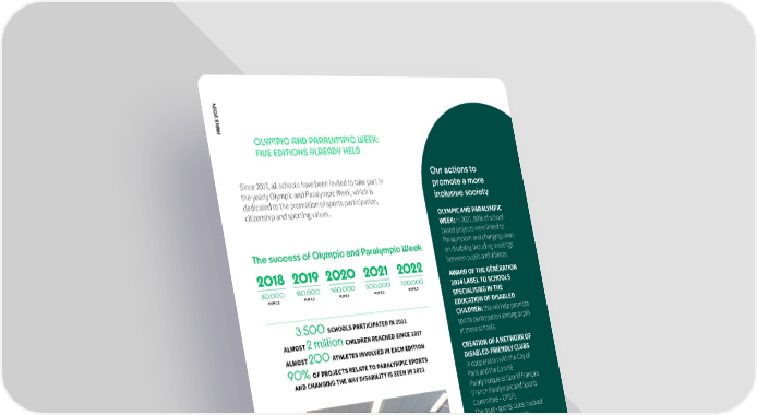 4 02 PARIS 2 OLYMPIC AND PARALYMPIC WEEK: FIVE EDITIONS ALREADY HELD Our actions to Since 2017, all schools have been invited to take part in promote a more the yearly Olympic and Paralympic Week, which is inclusive society dedicated to the promotion of sports participation, citizenship and sporting values. OLYMPIC AND PARALYMPIC WEEK: in 2021, 80% of school- based projects were linked to The success of Olympic and Paralympic Week Paralympism and changing views on disability, including meetings 2018 2019 2020 2021 2022 between pupils and athletes. 80.000 180.000 450.000 500.000 700.000 AWARD OF THE GÉNÉRATION PUPILS PUPILS PUPILS PUPILS PUPILS 2024 LABEL TO SCHOOLS SPECIALISING IN THE EDUCATION OF DISABLED 3.500 SCHOOLS PARTICIPATED IN 2021 CHILDREN: this will help promote ALMOST 2 million CHILDREN REACHED SINCE 2017 sports participation among pupils ALMOST 200 ATHLETES INVOLVED IN EACH EDITION at these schools. 90% OF PROJECTS RELATE TO PARALYMPIC SPORTS CREATION OF A NETWORK OF DISABLED-FRIENDLY CLUBS AND CHANGING THE WAY DISABILITY IS SEEN IN 2022 in cooperation with the City of Paris and the Comité Paralympique et Sportif Français (French Paralympic and Sports Committee – CPSF). The multi- sports clubs involved receive training in sports participation for disabled members. This project will be expanded from 2022, with the participation of the Département of Seine-Saint-Denis and its clubs. ROLL-OUT OF THE #EXPLORETERREDEJEUX2024 PROGRAMME in cooperation with the CPSF and the Assemblée des Départements de France S (Assembly of French Départements E M A – ADF). “Explore Terre de Jeux 2024” N G promotes venues and trails E P accessible to people with special 4 O needs in order to encourage 2 0 S 2 them to increase their participation I R in outdoor physical activity. A ©PHILIPPE MILLEREAU / KMSP P 37