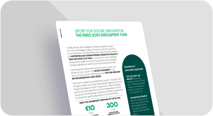 4 02 SPORT FOR SOCIAL INNOVATION: PARIS 2 THE PARIS 2024 ENDOWMENT FUND In 2020, the Paris 2024 endowment fund was established as part of the Paris 2024 legacy strategy. Promised as part of the city’s bid to host the Games, the fund is designed to promote social innovation by SUPPORTING AND STRENGTHENING INNOVATIVE PROJECTS THAT USE SPORT AS A TOOL to respond to the major challenges facing society: health and well-being, education and participation, inclusion, equality and solidarity, and sustainable development. In particular, the endowment fund will be used to support and Examples of develop actors involved in the SPORTS MOVEMENT as well successful applicants as the numerous not-for-pro昀椀t organisations THAT ARE INVOLVED ON THE GROUND ON A DAILY BASIS. THE LÉO SPORT JOB Two calls for projects have already been issued in conjunction with PROJECT helps young the Agence Nationale du Sport (National Sport Agency), the Comité National Olympique et Sportif Français (French National Olympic people aged between 16 and 25 to re-enter the job market and Sports Committee) and the Comité Paralympique et Sportif thanks to a two-fold socio- Français (French Paralympic and Sports Committee), supported by professional and sports the City of Paris and the Département of Seine-Saint-Denis. coaching programme. SINCE THE ENDOWMENT FUND WAS SET UP IN 2020: THE NATUR’EST PROJECT promotes outdoor sport and €10 300 encourages people to change million projets their behaviour in order to HAS BEEN DISBURSED HAVE RECEIVED make physical activity an FINANCIAL SUPPORT €3.5 million by Paris 2024, environmentally responsible €6 million by its 昀椀nancing partners pursuit. 700.000 70% THE AVITSIM PROJECT people have benefitted of projects funded runs beginners’ para-rowing ARE LOCATED courses for disabled people (young people, girls, those IN PRIORITY AREAS using electrostimulation. with a disability, refugees, the vulnerable, etc.) The sports movement has been involved in all funded projects. S E M A N G E P 4 O 2 0 S 2 I R A P 38 ©skynesher/Getty Images