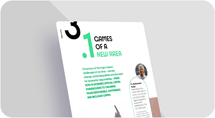 4 02 PARIS 23 GAMES .1OF A NEW AREA Conscious of the major shared challenges of our time – climate change, social inequalities and the need © P P for economic responsibility – PARIS HILI KMS PP / E AU 2024 IS WORKING WITH ALL GAMES Pr. Muhammad MILLERE STAKEHOLDERS TO ORGANISE MORE RESPONSIBLE, SUSTAINABLE Yunus AND INCLUSIVE GAMES. Nobel Peace Prize winner 2006, chair of the Yunus Centre and part of Paris 2024’s legacy programme as one of the stakeholders of the ESS 2024 project "The Games provide a wonderful opportunity to use sport to promote social issues and foster solidarity. Turning words into actions is a real challenge that the Paris 2024 organisers have agreed to take on." S E M A N G E P 4 O 2 0 S 2 I R A P 22 © Hinterhaus Productions/Getty Images