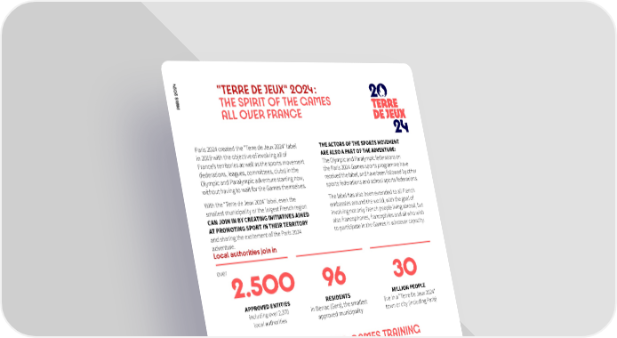 4 02 "TERRE DE JEUX" 2024 : PARIS 2 THE SPIRIT OF THE GAMES ALL OVER FRANCE Paris 2024 created the "Terre de Jeux 2024" label THE ACTORS OF THE SPORTS MOVEMENT in 2019 with the objective of involving all of ARE ALSO A PART OF THE ADVENTURE: France’s territories as well as the sports movement The Olympic and Paralympic federations on (federations, leagues, committees, clubs) in the the Paris 2024 Games sports programme have Olympic and Paralympic adventure starting now, received the label, and have been followed by other without having to wait for the Games themselves. sports federations and school sports federations. With the "Terre de Jeux 2024" label, even the The label has also been extended to all French smallest municipality or the largest French region embassies around the world, with the goal of CAN JOIN IN BY CREATING INITIATIVES AIMED involving not only French people living abroad, but AT PROMOTING SPORT IN THEIR TERRITORY also francophones, francophiles and all who wish and sharing the excitement of the Paris 2024 to participate in the Games in whatever capacity. adventure. Local authorities join in over 2.500 96 30 APPROVED ENTITIES RESIDENTS MILLION PEOPLE including over 2,370 in Berrac (Gers), the smallest live in a "Terre De Jeux 2024" local authorities approved municipality town or city (including Paris) PRE-GAMES TRAINING CENTRES: HOSTING CHAMPIONS IN THE MAKING In the three years leading up to Games, a network of 780 pre- Games training facilities throughout France will welcome international teams preparing for Paris 2024. These base camps will play a key role in athletes’ training and preparation, enabling them to train in facilities with optimal conditions; to acclimatise and project themselves into 2024, while soaking up the atmosphere of the host country. S The selection of the 780 centres, which span 415 local French E M A authorities, was carried out jointly by Paris 2024, together with N G the French NOC, NPC and a number of Olympic and Paralympic E P sports federations. The aim was to guarantee the highest quality 4 O 2 of equipment and facilities for athletes. 0 S 2 I R The list of Pre-Games Training Centres is available on https:// A © Benjamin Boccas P prepare.paris2024.org. 20
